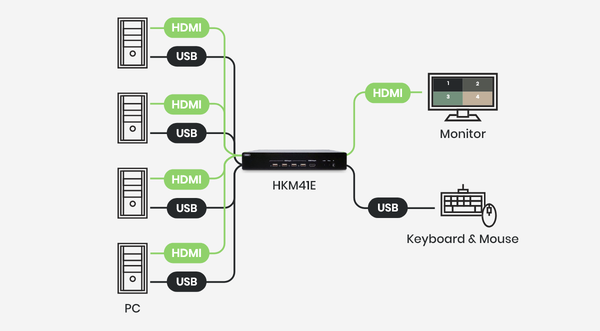 SC&T’s HKM41E is a 4-in-1-out HDMI® switch that supports 1080p @60Hz 4:4:4. More than an HDMI® switch, HKM41E provides the multiview function for monitoring four audio and video inputs in real time. In addition, with the mouse roaming function, you can directly control the four videos in the Multiview mode.