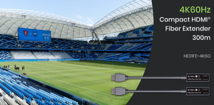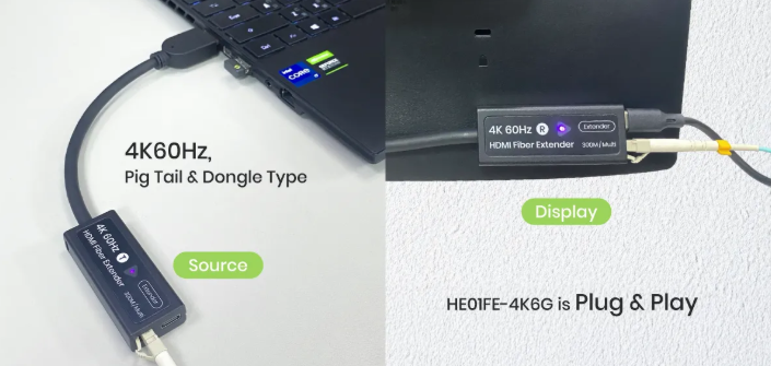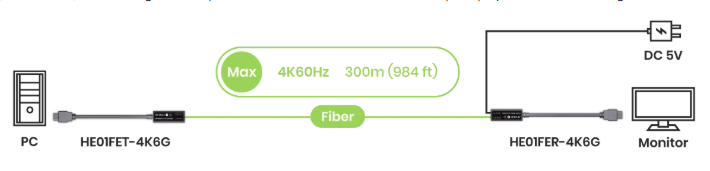 HE01FE-4K6G is an HDMI® over fiber optic extender kit (TX and RX) with an LC connector to transmit uncompressed 4K60Hz HDMI® signals. It supports EDID and HDCP pass-through over a single multi-mode fiber. (OM3 / OM4) Its small form and of solid build and easy installation.