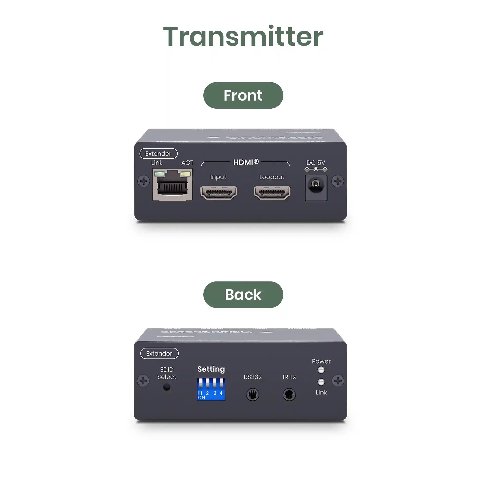 - Built-in local loop out for an extra HDMI® display at TX side.