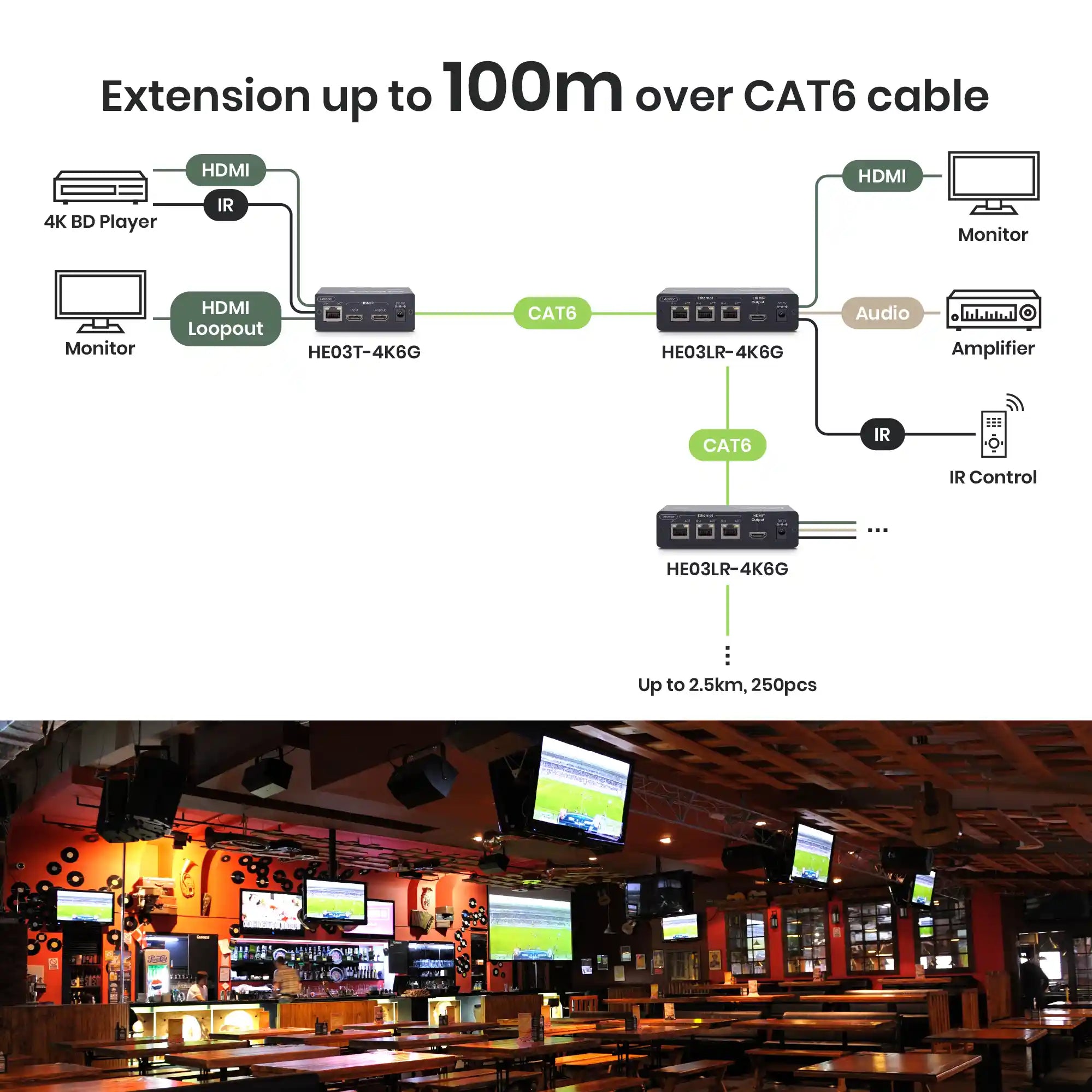 - Splits up to 250 HDMI® displays, 2.5KM in total.
