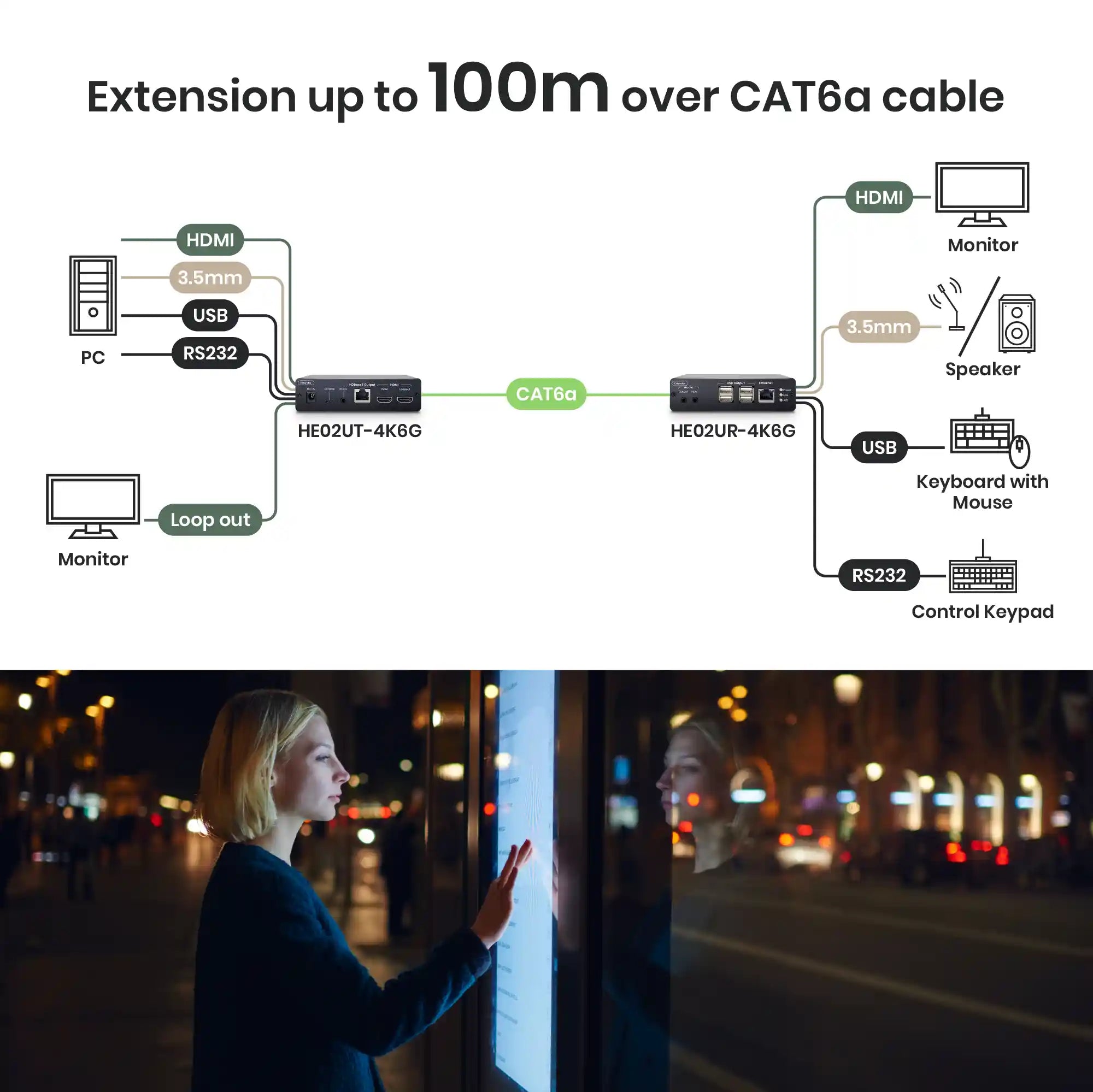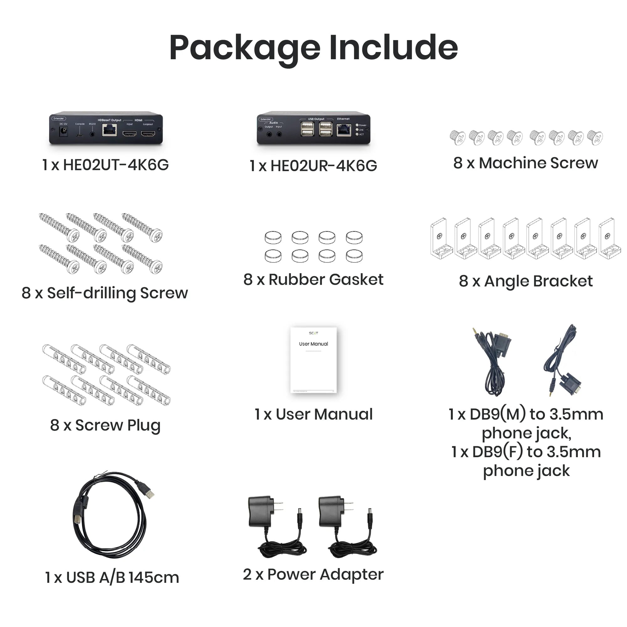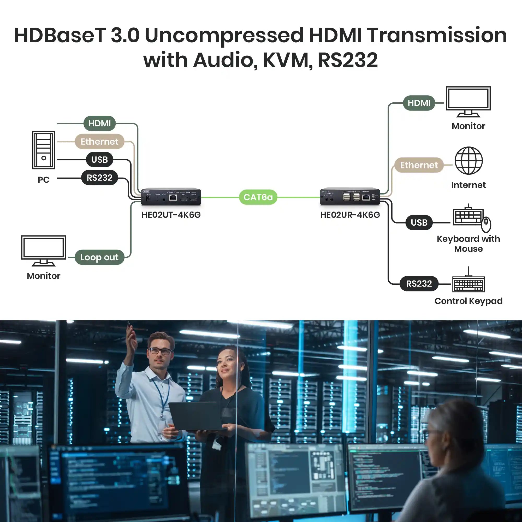 HE02U-4K6G is an HDMI over HDBaseT 3.0 Extender which is able to send uncompressed video, digital & analog audio, RS232 signals, with resolution up to 4K@60Hz 4:4:4 and transmission distance up to 100