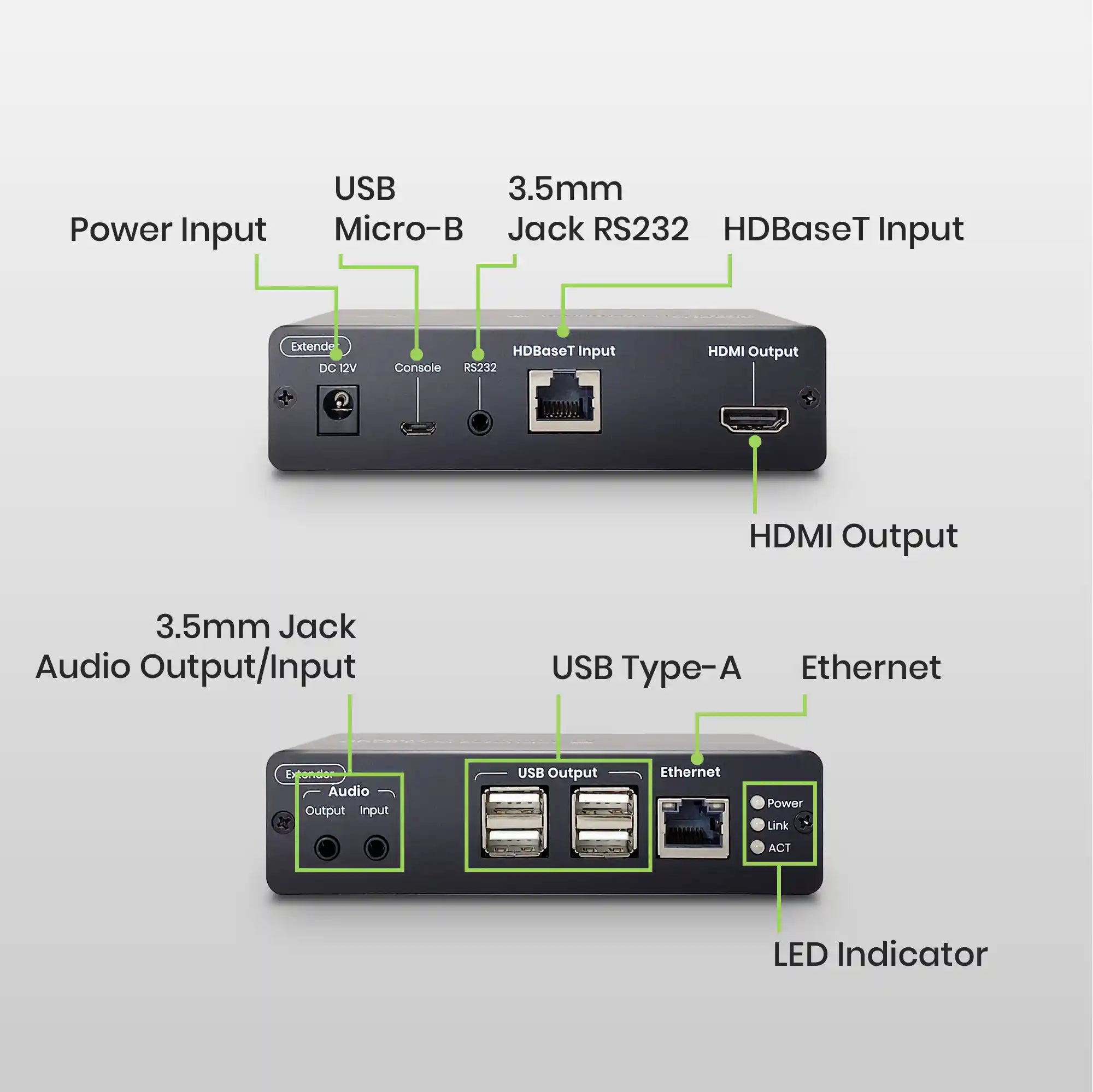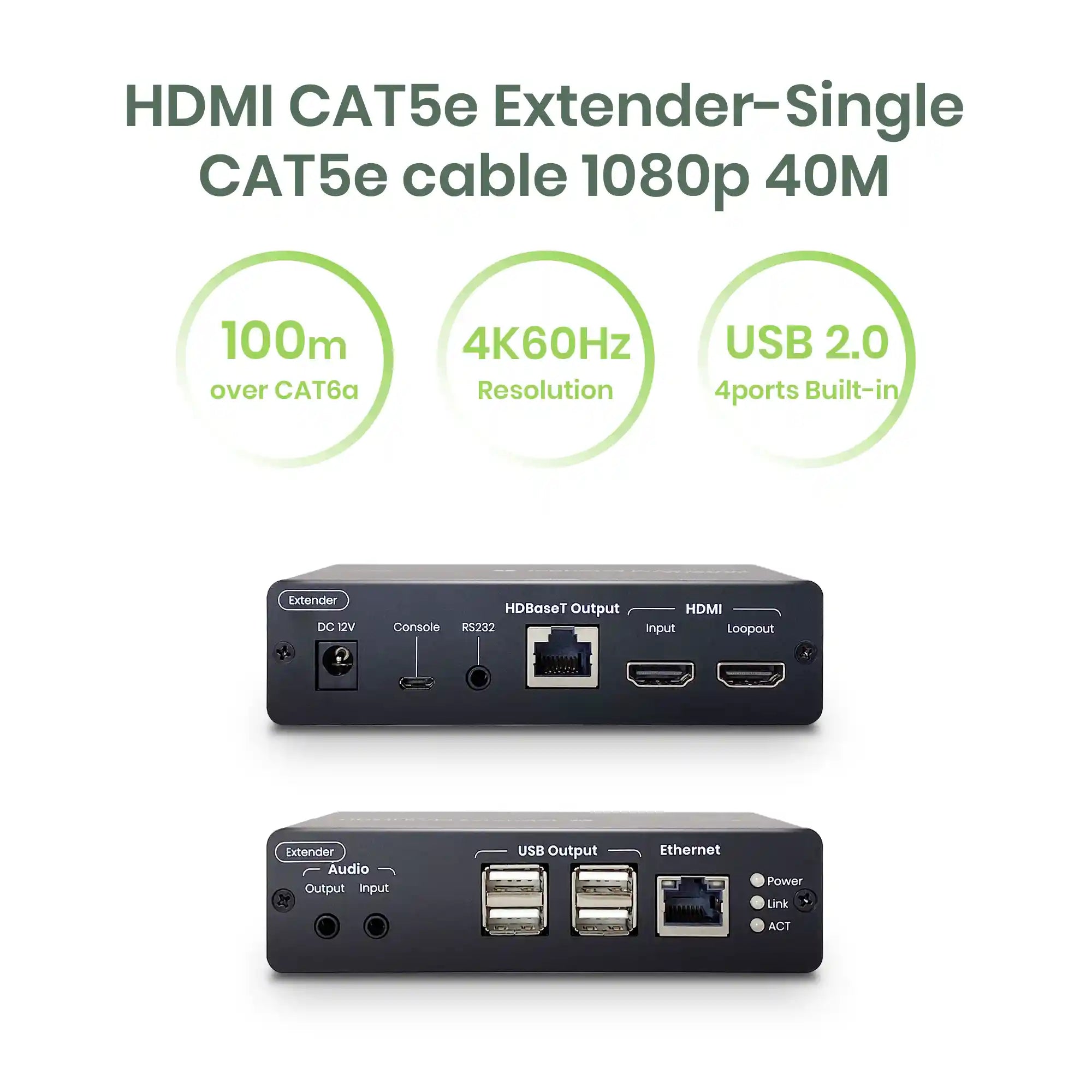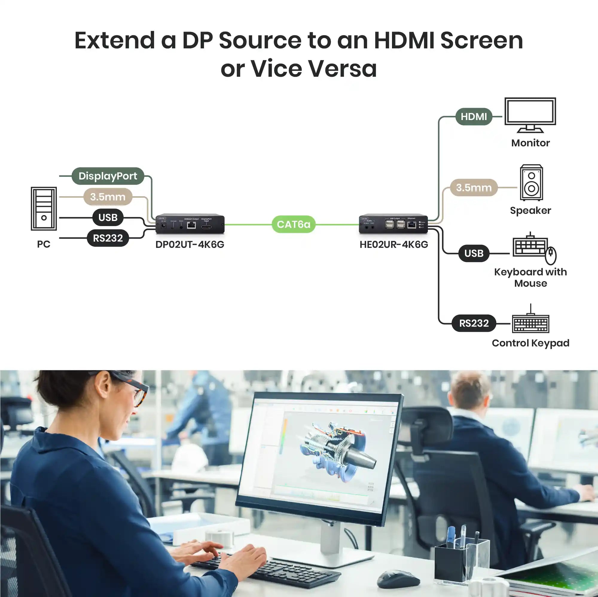 HE02U-4K6G is an HDMI over HDBaseT 3.0 Extender which is able to send uncompressed video, digital & analog audio, RS232 signals, with resolution up to 4K@60Hz 4:4:4 and transmission distance up to 100