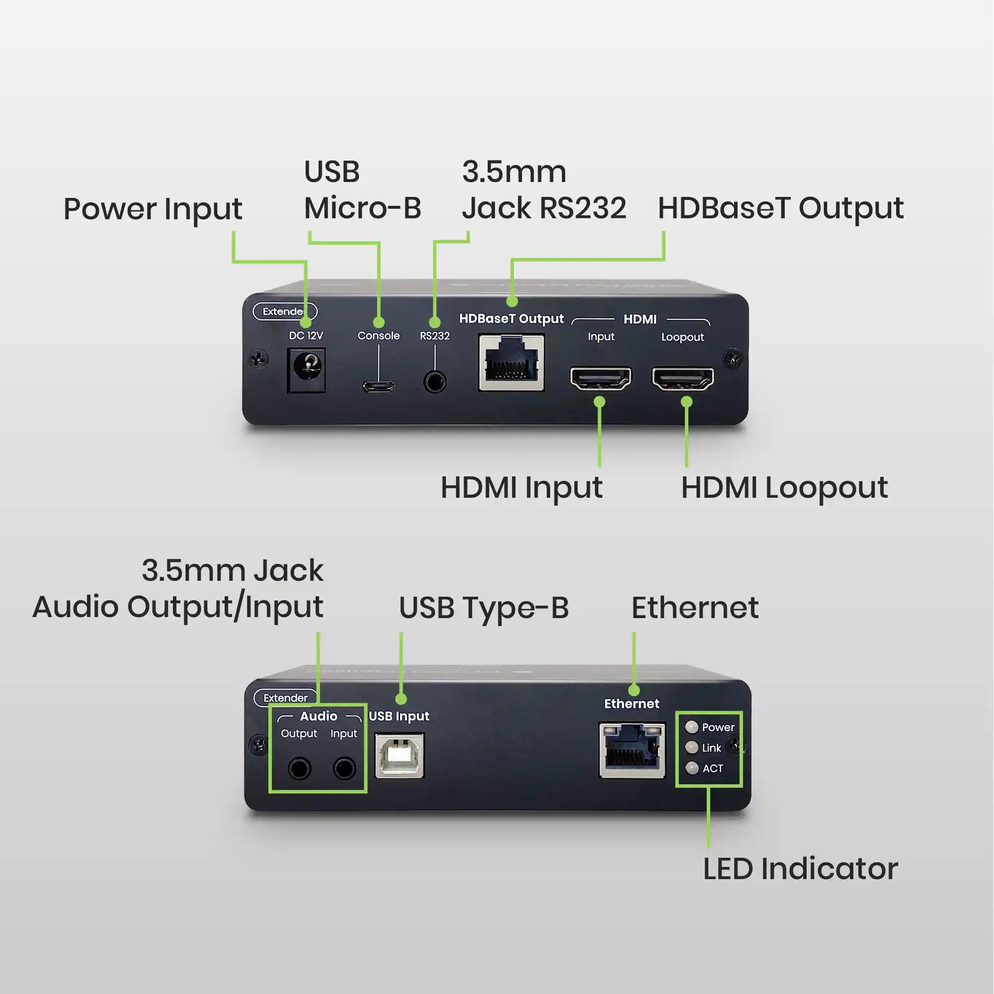ITEM NO.: HE02UT-4K6G | Compliance: HDMI 2.0, HDCP 1.4/2.2, USB 2.0 | Max. Video Resolution: 4K@60Hz 4:4:4 | RS-232 Baud Rate: 115200 bps/ Full duplex | Video Input: 1 x HDMI | Video Output: 1 x HDBaseT1 x HDMI (loopout) | Audio Input: 1 x 3.5mm Phone Jack | Audio Output: 1 x 3.5mm Phone Jack | USB Connector: 1 x USB Type-B | RS232 Interface: 1 x (3.5mm) Phone Jack | Console (Firmware Upgrade): 1 x USB Micro-B | LED Indicators: 3-LED Status: Power/Link/ACT | Power Supply: 12V 1.5A | Power Consumption: <6W | Operation: 0 to 45℃ | Storage: -40 to 80℃ | Operating Altitude: 2000m | Humidity: Up to 95% | Dimensions: 125 x 123 x 32mm | Weight: 363g