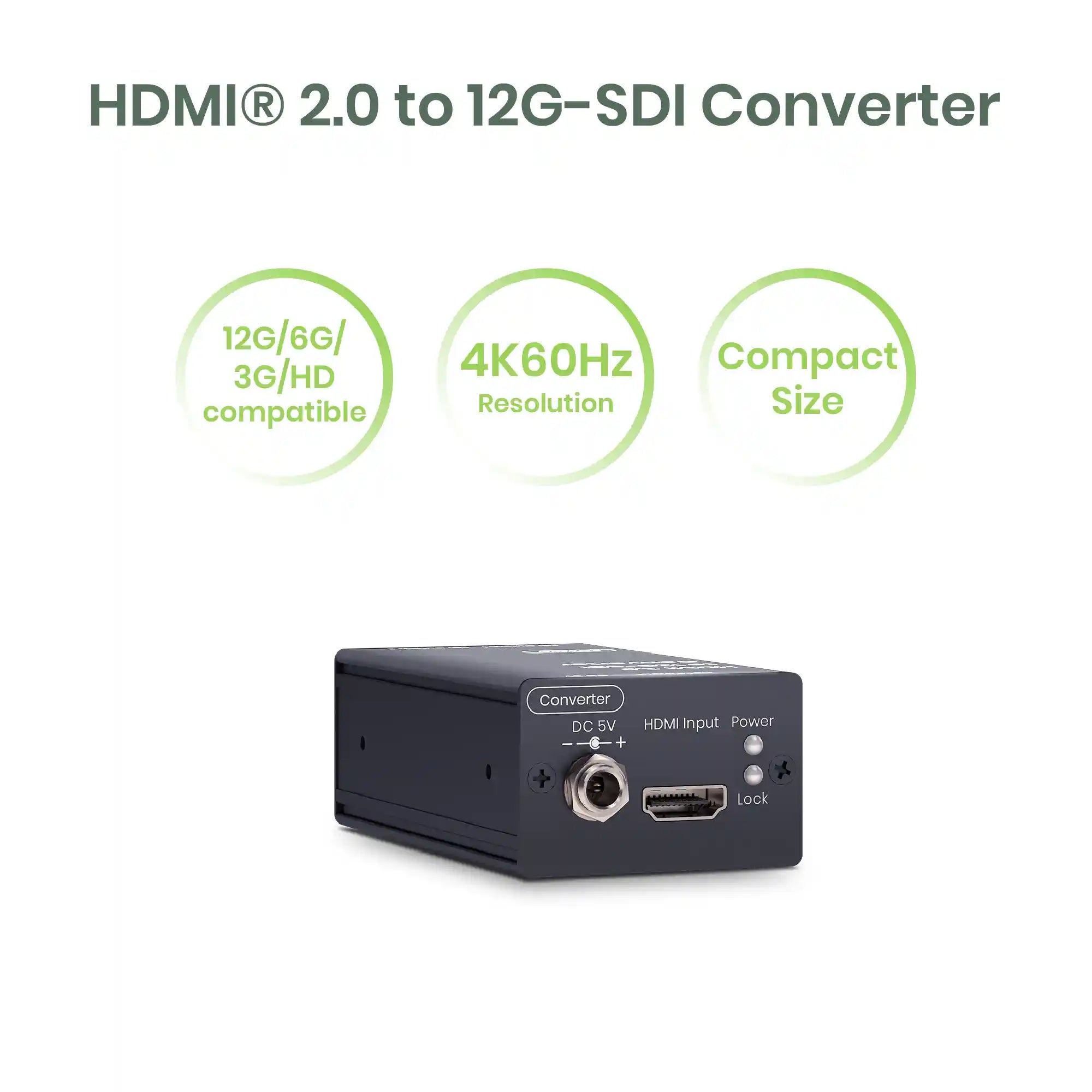 SDI02E-12G is an HDMI® 2.0 to 12G-SDI converter thatturns consumer HDMI into SDI signals for broadcast applications.