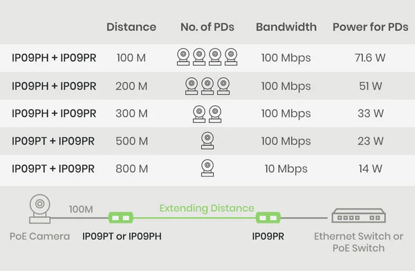 IP09PK is a point-to-point 800m (2,624ft) Long-Range PoE Extender that uses a single ethernet cable (CAT5e, CAT6, CAT7) to transmit PoE signals. IP09P supports IEEE 802.3 at, 802.3 af, 802.3 bt