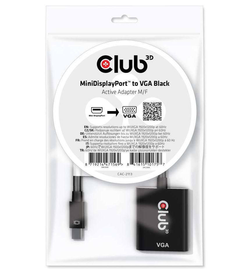 The Club 3D CAC-2113 is an active MiniDisplayPort™ to VGA signal converter. It enables you to connect your analog VGA Televisions, Monitors or Projectors to your Desktop or Laptop with MiniDisplayPort™ output. The adapter offers hassle free plug and play functionality, so no Driver installation needed and it is powered by the MiniDisplayPort™ output. The MiniDisplayPort™ interface in the adapter consists of two main lanes for DP™ data, AUX channel, HPD signal and power. The VGA output is compliant to VSIS standard and supports up to WUXGA RB timings. Supports resolutions up to WUXGA 1920x1200p @ 60Hz.The adapter works with AMD, Nvidia and Intel Graphic Solutions.