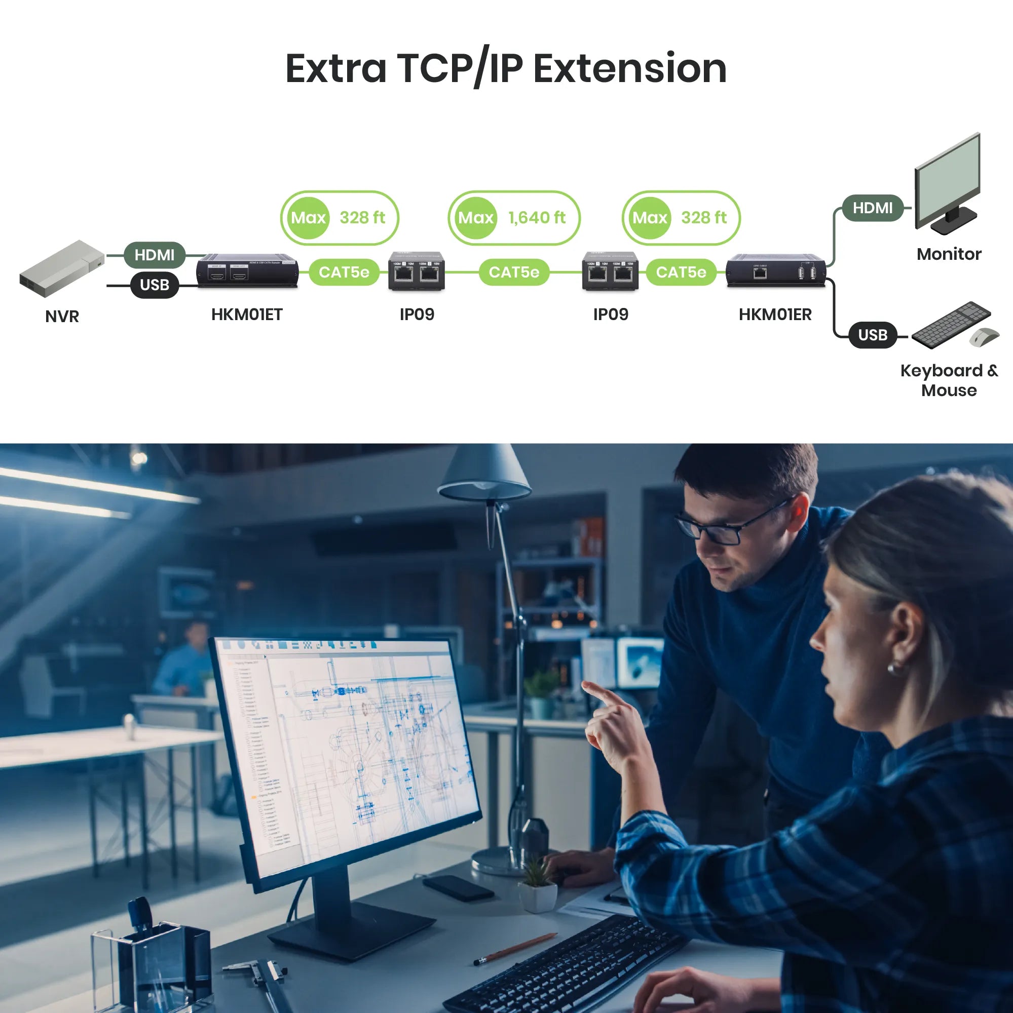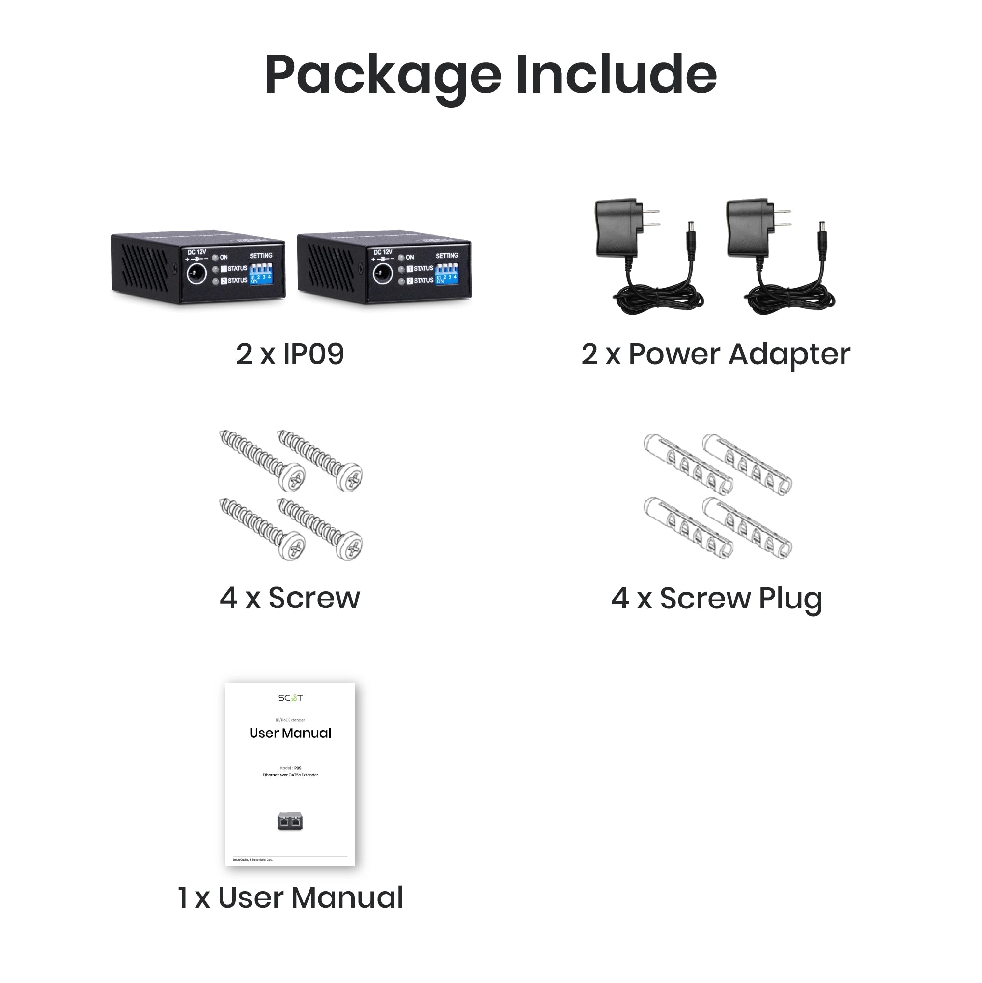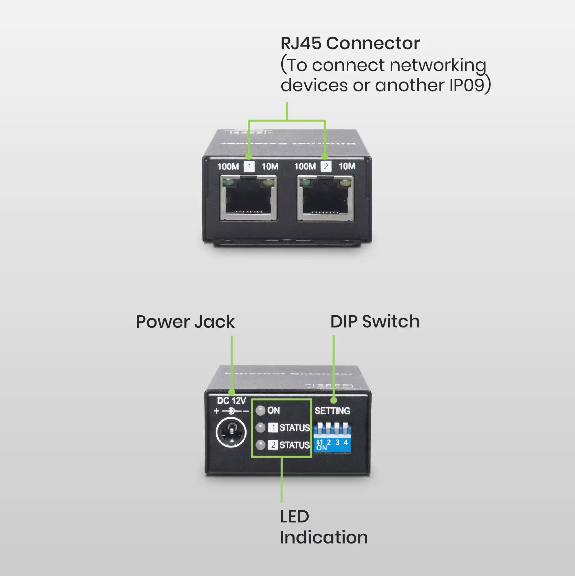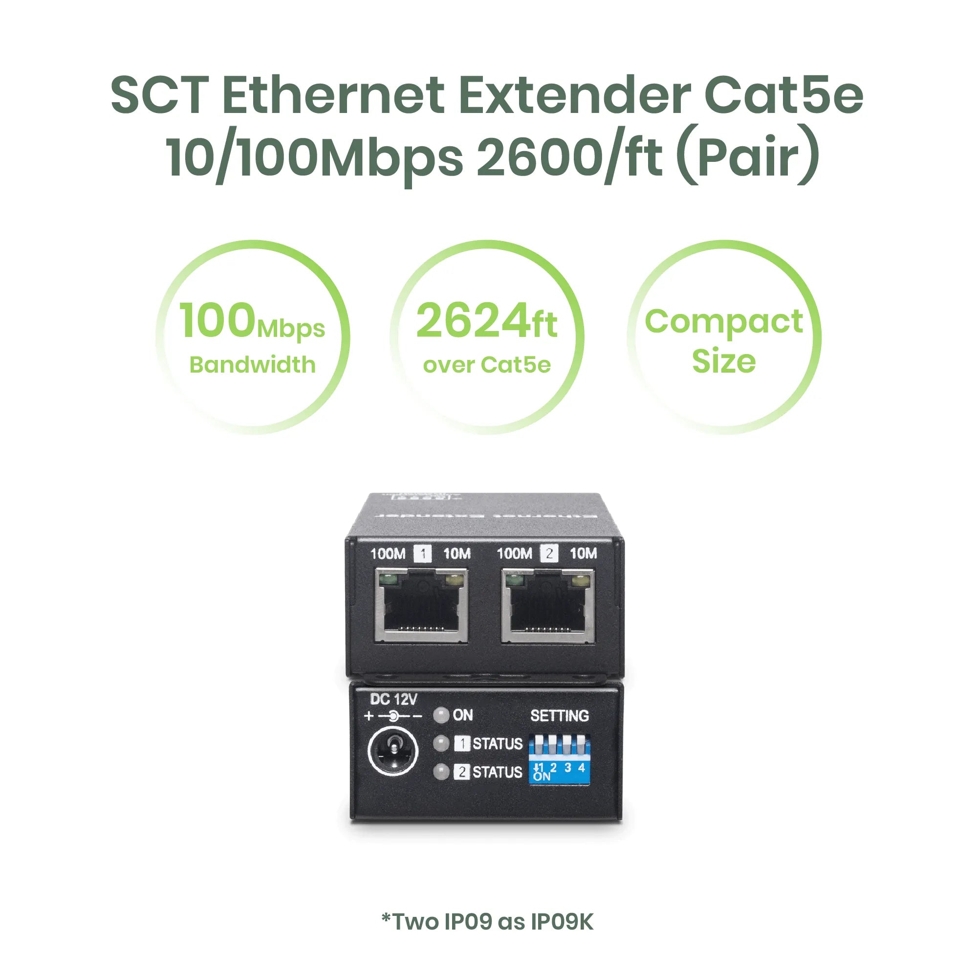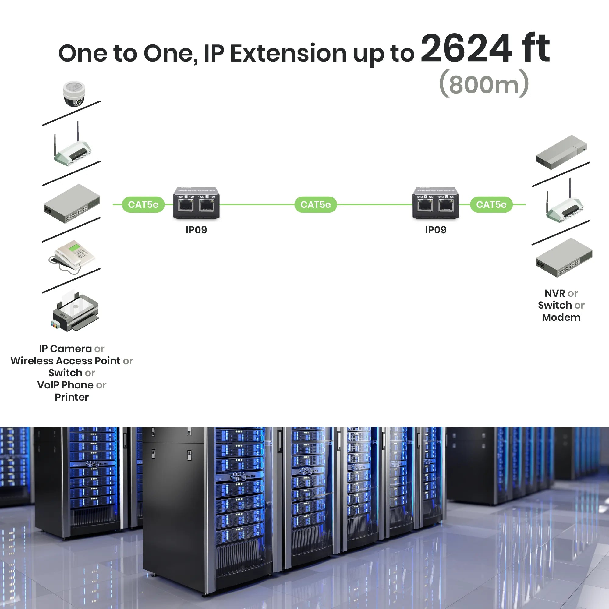The IP09K is a pair of Ethernet extenders designed to extend network signals over Ethernet cables. By installing one IP09 at each end of your setup, you can extend the reach of CAT5e or CAT6 network devices up to 2624 ft (800m). It supports a maximum transmission speed of 100Mbps within 1640 ft (500m) and 10Mbps beyond that distance, compared to the typical network range of 328 ft (100m).
