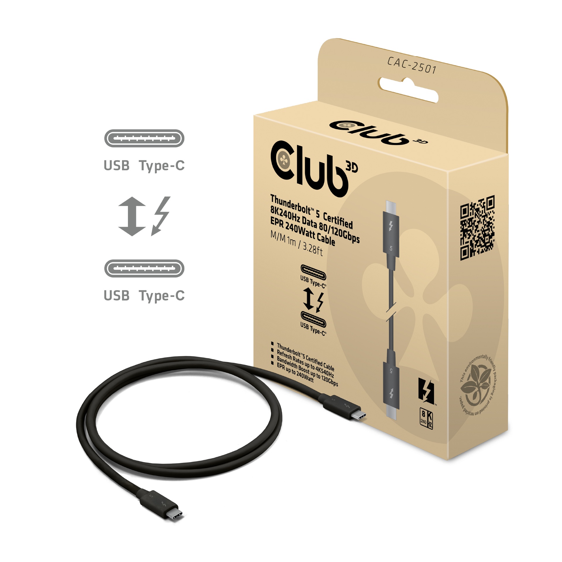 CAC-2501 HIGH PERFORMANCE: 1m / 3.28ft Thunderbolt™ 5 cable supports 80 Gbps, 8K video, and 240W EPR power; USB -C® to -C® connectors offer universal compatibility with Thunderbolt™ 3 & 4, USB80Gbps, and other USB -C® devices
