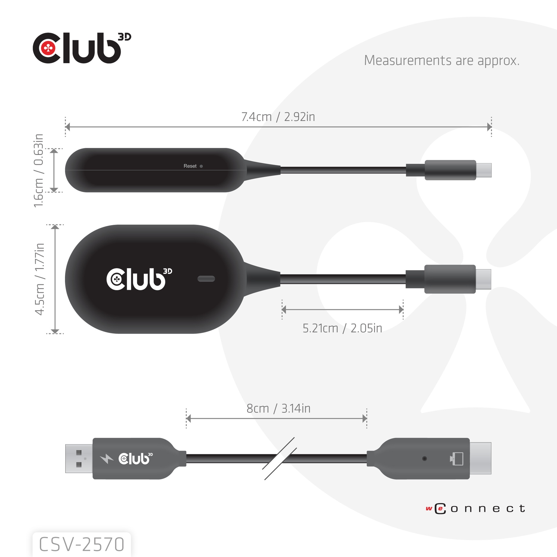 CSV-2570 is unique wireless HDMI™ device. With a transmitter and receiver, it wirelessly streams Full HD video and audio from USB-C® alt-mode devices to HDMI™ displays. • WIRELESS PRESENTATIONS & ENTERTAINMENT: Stream from your USB-C® laptop, tablet, or phone to any HDMI™ display – ideal for business meetings, classrooms, or watching content on a big screen. • INSTANT SETUP – NO DRIVERS NEEDED: Plug and play with Windows®, macOS®, ChromeOS™, Android™. • FULL HD WIRELESS HDMI™: Delivers smooth 1080p video and audio transmission up to 25 meters 82 feet with low latency over a reliable 5GHz wireless point to point connection. • POWERED BY USB-A (5V): Just plug the receiver into an HDMI™ port and a USB-A port on your TV or projector – no external power supply required. The extender receiver is powered by the USB on the Panel/TV or Monitor. This extender is categorized as an SRD (Short range Device) and works in an unlicenced band and is secure.